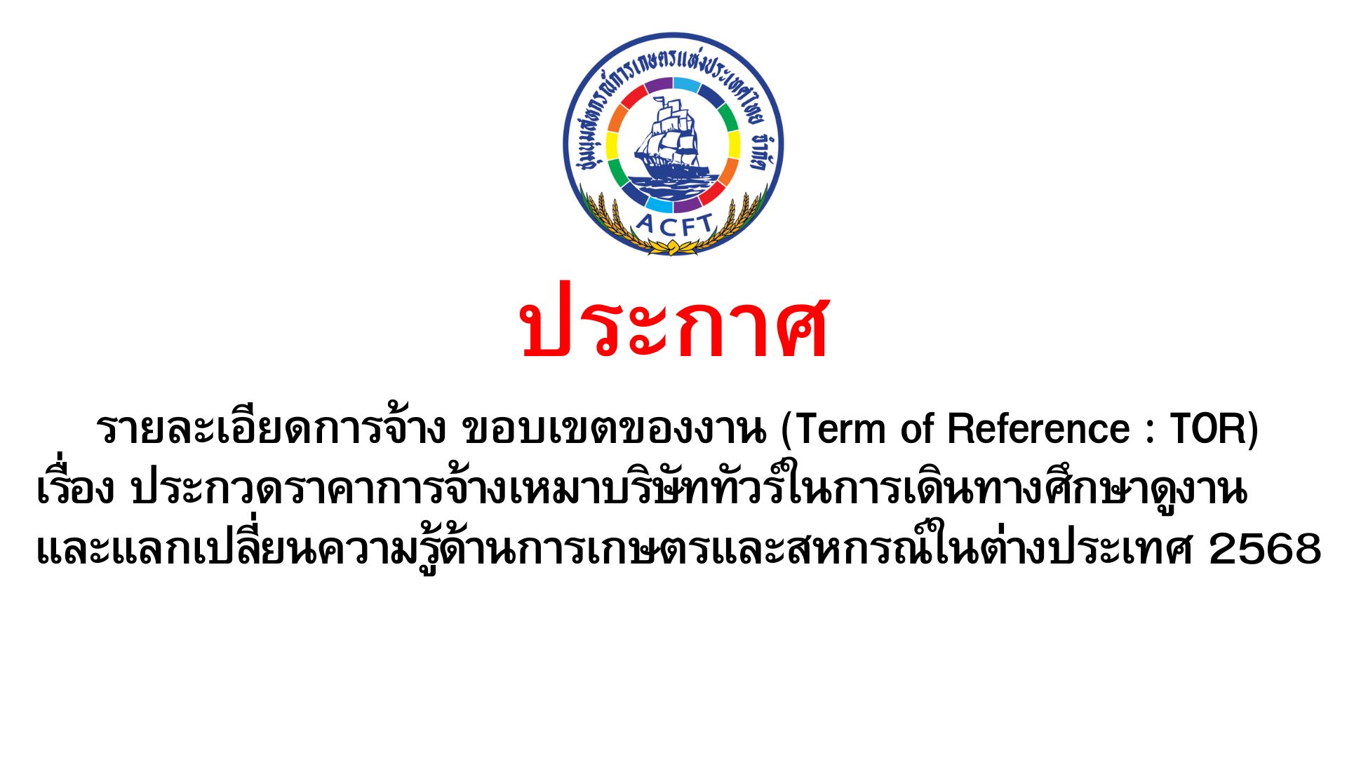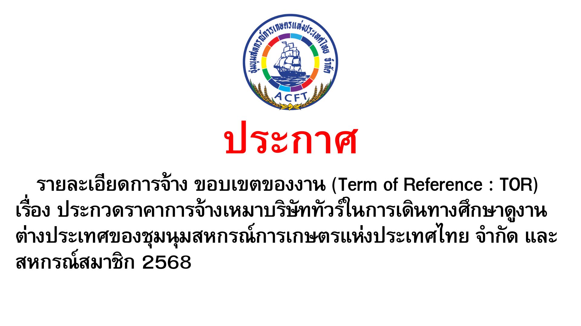 (New) ประกาศ TOR เรื่อง ประกวดราคาการจ้างเหมาบริษัททัวร์ในการเดินทางศึกษาดูงานต่างประเทศของชุมนุมสหกรณ์การเกษตรแห่งประเทศไทย จำกัด และสหกรณ์สมาชิก 2568