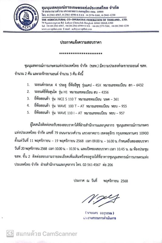 ชสท.มีความประสงค์จะขายรถยนต์ ชสท. จำนวน 2 คัน และรถจักรยานต์ จำนวน 3 คัน